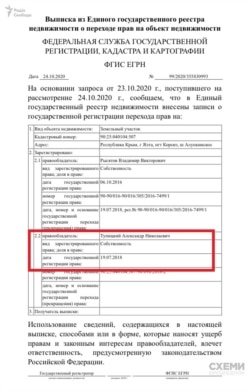 Александр Тупицкий еще до аннексии Крыма Россией в 2014 году владел имением и землей под ним в Кореизе близ Ялты. Но в 2018 году он расширил свои владения, оформив еще один участок возле дома в свою собственность. Об этом свидетельствует официальный документ, полученный "Схемами" из Единого госреестра недвижимости России.